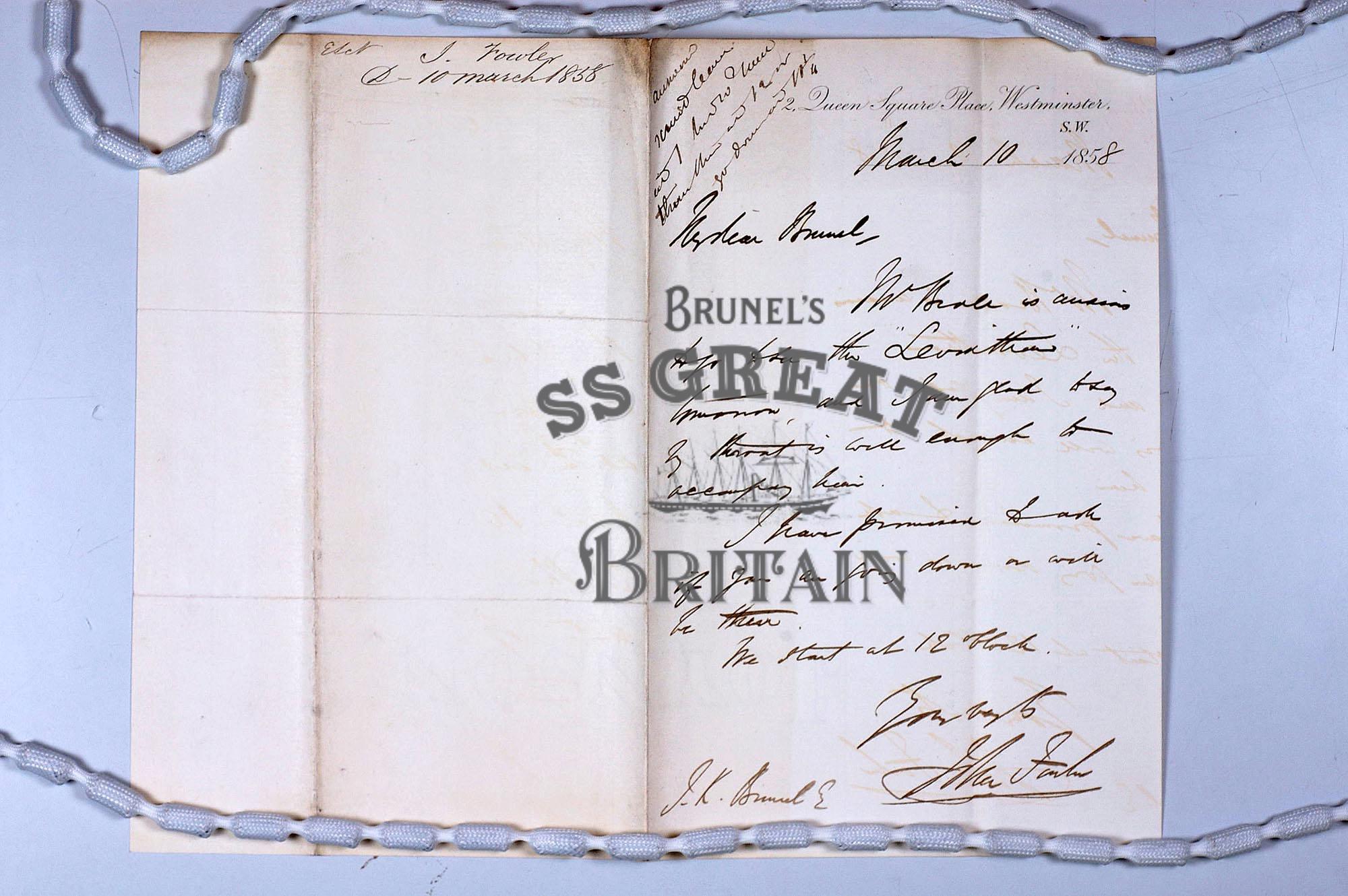 DescriptionWritten from 2 Queen Square Place, Westminster. The letter explains that Fowler is well enough to accompany someone to visit the Great Eastern and wonders if Brunel will be at the ship at the same time.