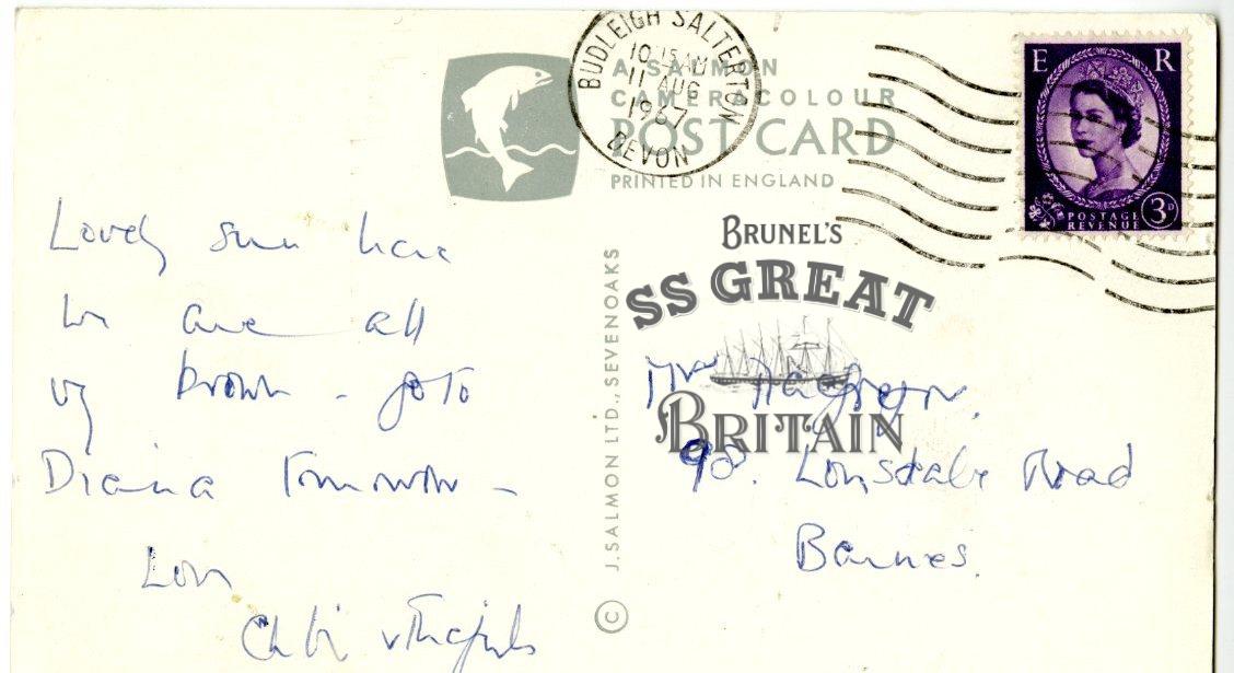 DescriptionRecto: Four landscape orientated views of Budleigh Salterton in Devon. First, view from West Cliff of beach and promenade. Second, Fisherman's Beach showing beached dinghies in foreground and town on cliffside in background. Third, view of East Budleigh showing cottages, two women walking down street and church in background. Fourth, view from East Cliff showing beach and town. Verso: card is stamped and postmarked, sent to Mrs MacGregor with short message about holiday. Sender not legible.