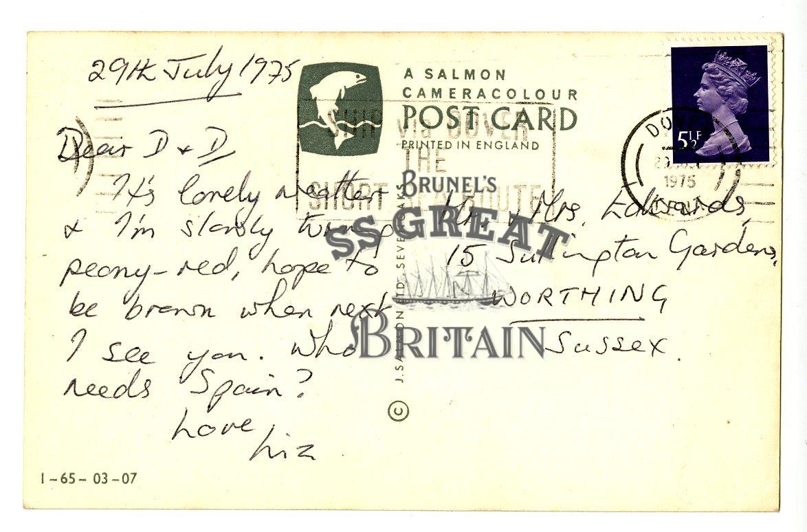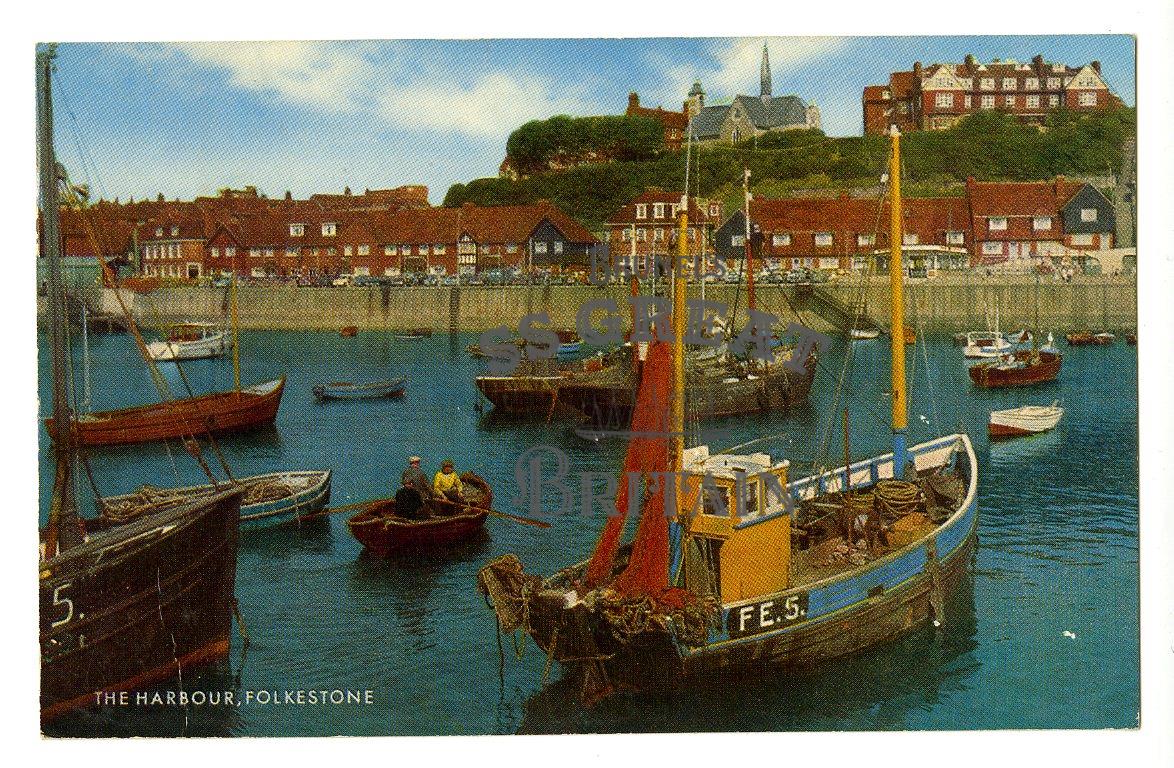 DescriptionLandscape orientation. Recto - view of Folkestone's harbour showing boats and buildings with church up on the hill. Verso - message about good weather. From Liz. Sent to Mr and Mrs Edwards. 5 1/2p stamp.