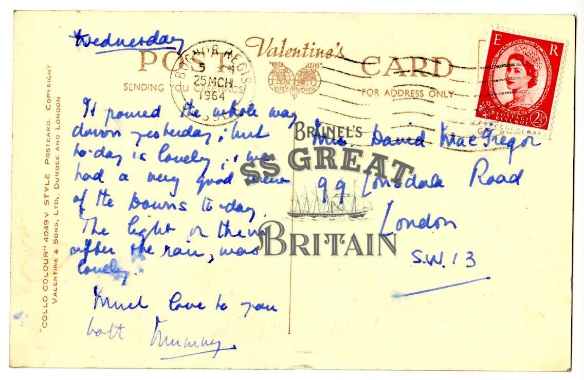 DescriptionLandscape orientation. Recto - view of The Beach, Elmer Sands, Middleton-On-Sea depicting the shoreline with grass fields in foreground and beached dinghies in middle ground. People walking in foreground. Verso - Hand written message describing weather and view. From Mummy. Sent to Mrs David MacGregor. 21/2d stamp.
