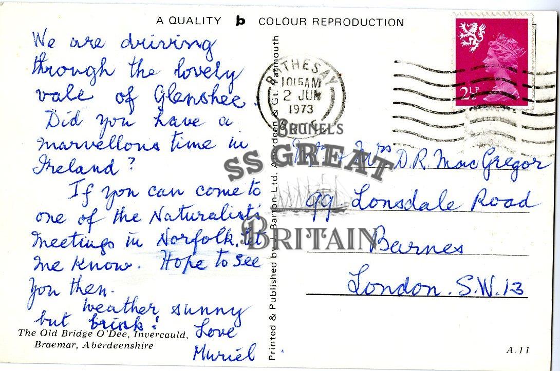 DescriptionLandscape orientation. View of The Old Bridge O'Dee, Invercauld, Braemar, Aberdeenshire. Recto: River in foreground, bridge in middle ground, mountains in background. Verso: message about holiday and some questions for the MacGregors. Franked 2 June 1973. 21/2 d stamp.