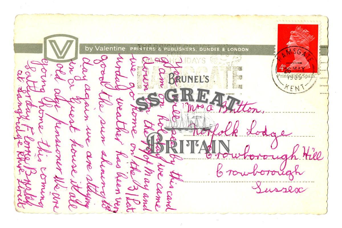 DescriptionLandscape orientation. Recto: colour saturated low view of the inner harbour at Ramsgate, Kent, showing boats and buildings. Verso: message in red ink at 90 degrees right about good weather. Sent to Mrs A Britton in Crowborough, Sussex. Postmarked Ramsgate Kent, 26th May 1969 with a 4d stamp. Deckle edged.