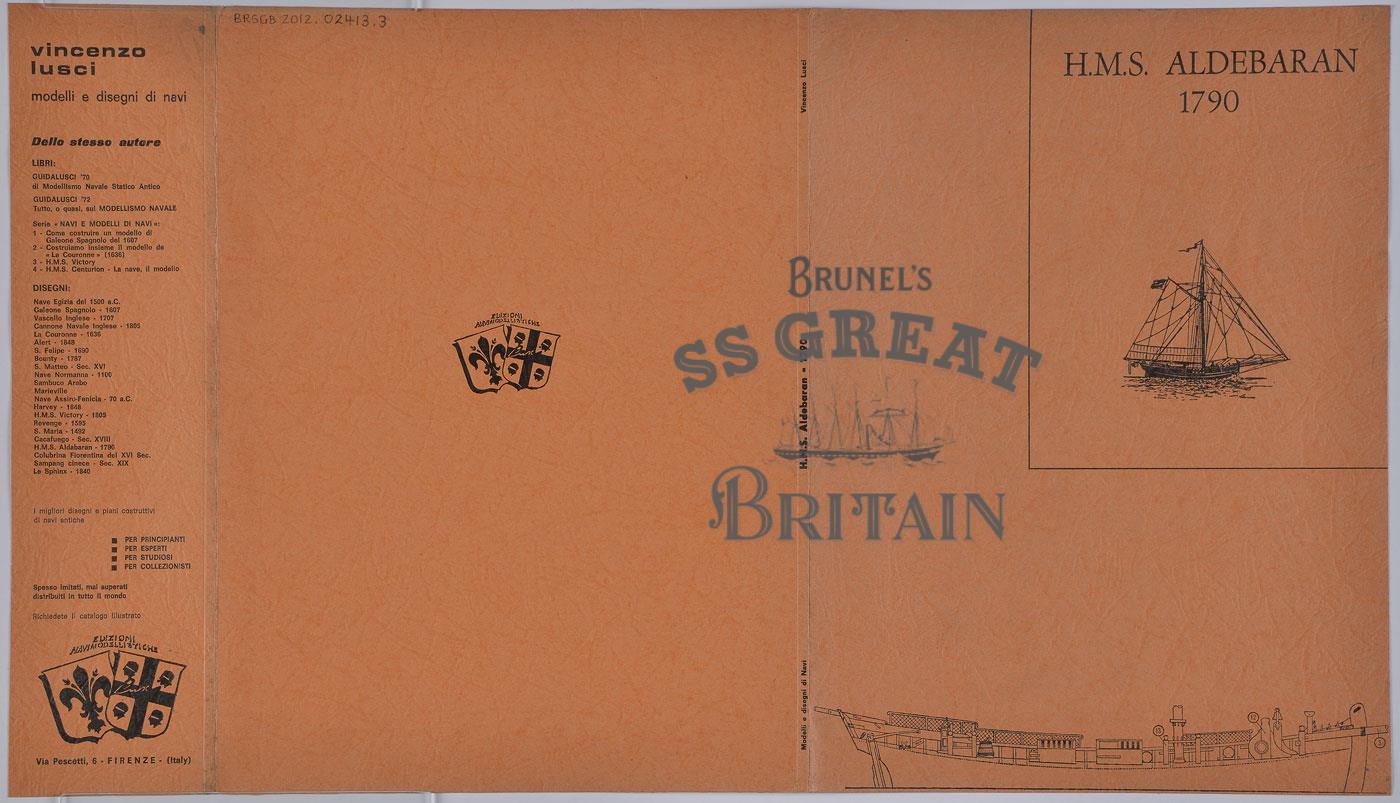 DescriptionHolder for ship modelling plans of cutter HMS Aldebaran. Orange folder with "H.M.S. Aldebaran 1790", illustration and profile of the ship printed in black ink on the front cover. Producers name and other information printed in italian on section inside the holder. Producers logo on back cover.