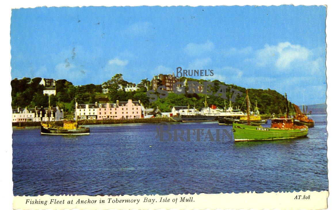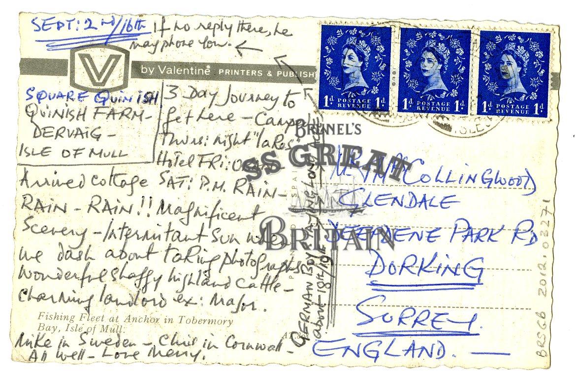 DescriptionLandscape orientation. Deckle edged. Recto: Fishing Fleet at Anchor in Tobermory Bay, Isle of Mull. Shows green vessel on right, buildings on quayside in midground, wooded hill with buildings in background. Verso: message about camping, rain. 3 x 1d stamps.