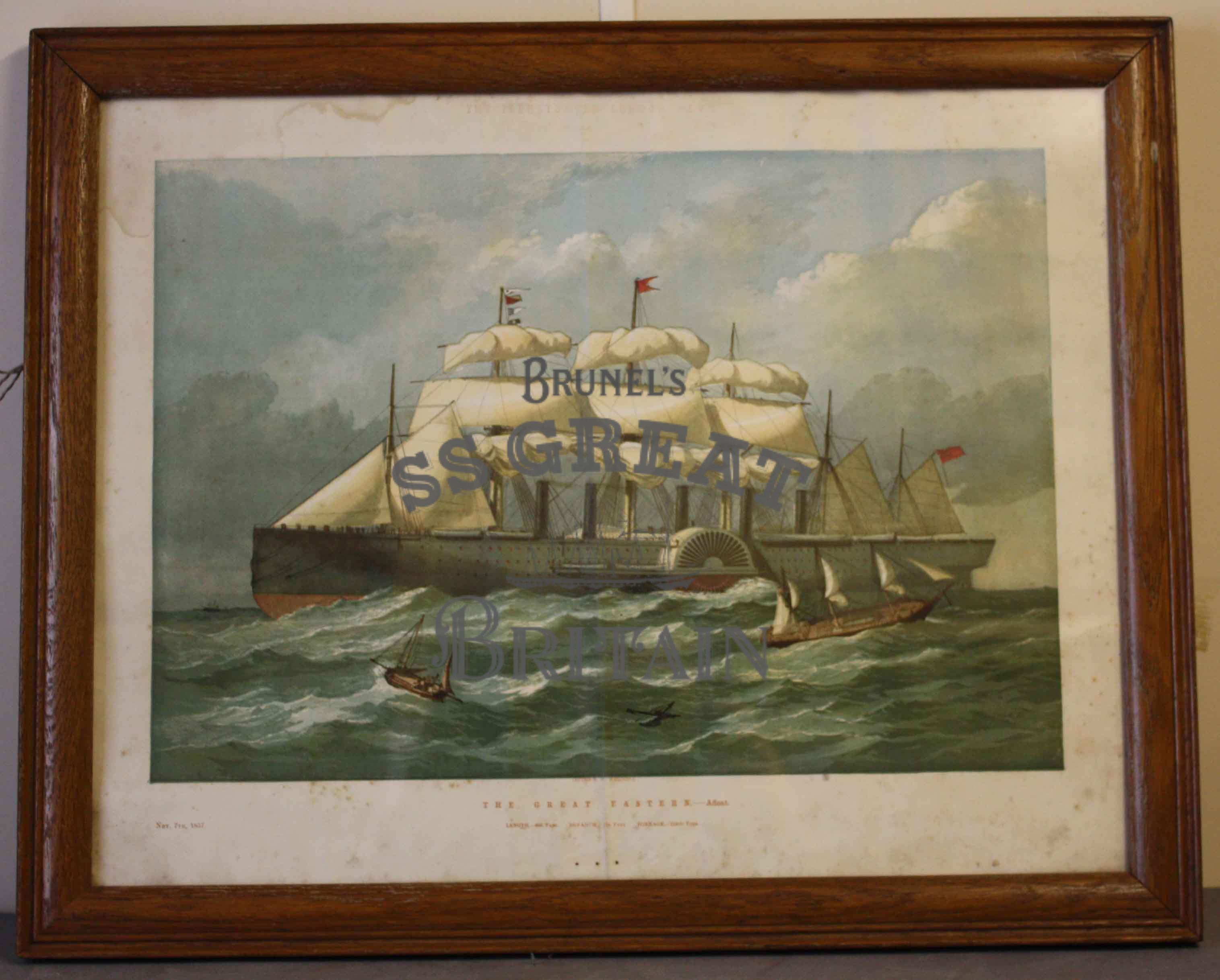 DescriptionColoured print of the ss Great Eastern at sea. Print from the Illustration London News after a painting by E. W. Weedon. Shows the Great Eastern at sea, view of port side. Most sails are set, choppy sea, clouds in the background, two smaller vessels in the foreground.