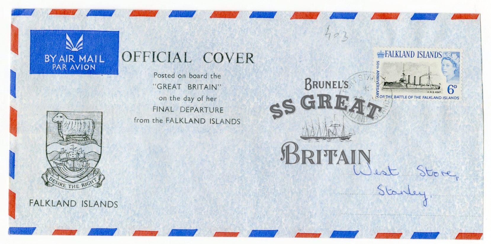 DescriptionA collection of 10 first day covers. Envelopes with images printed on front, commemorating the return of the ss Great Britian from the Falkland Islands to Bristol. Stamps show images of ss Great Britain and are dated: 24 July 1970, 30 October 1970, 15 January 1969, and 23 June 1970. Posted on board the ss Great Britain on the day of her departure from the Falkland Islands.