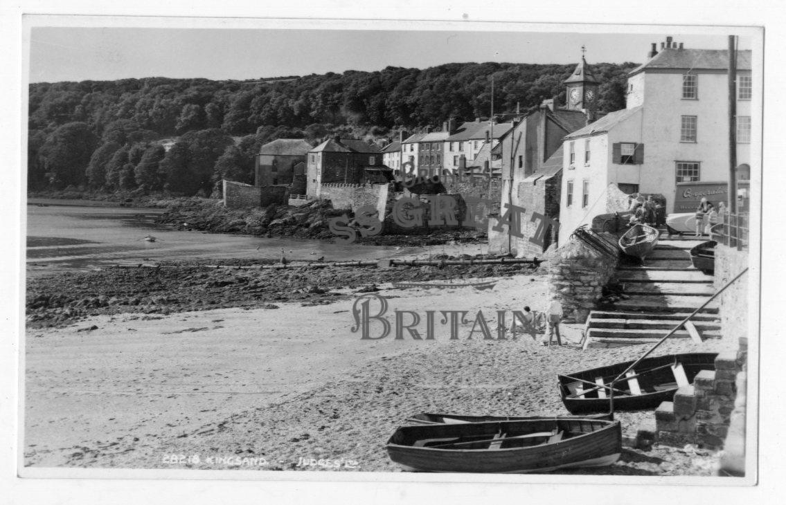 DescriptionLandscape orientation. Recto: Kingsand. Shows rowing boats drawn up on stony beach in foreground, steps on right up to buildings, woman in deckchair, wooded hill in background. Verso: blank.