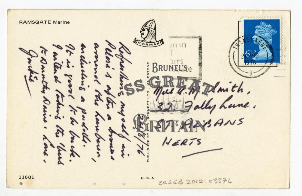 DescriptionLandscape orientation. Recto: Ramsgate Marine. Shows wall and fairy lights in foreground, moored boats in midground, cars and buildings beside harbour on left and background. Verso: message about refreshments at Pelosi's after pedallo.Franked 24 Aug 1976. 6 1/2p stamp.