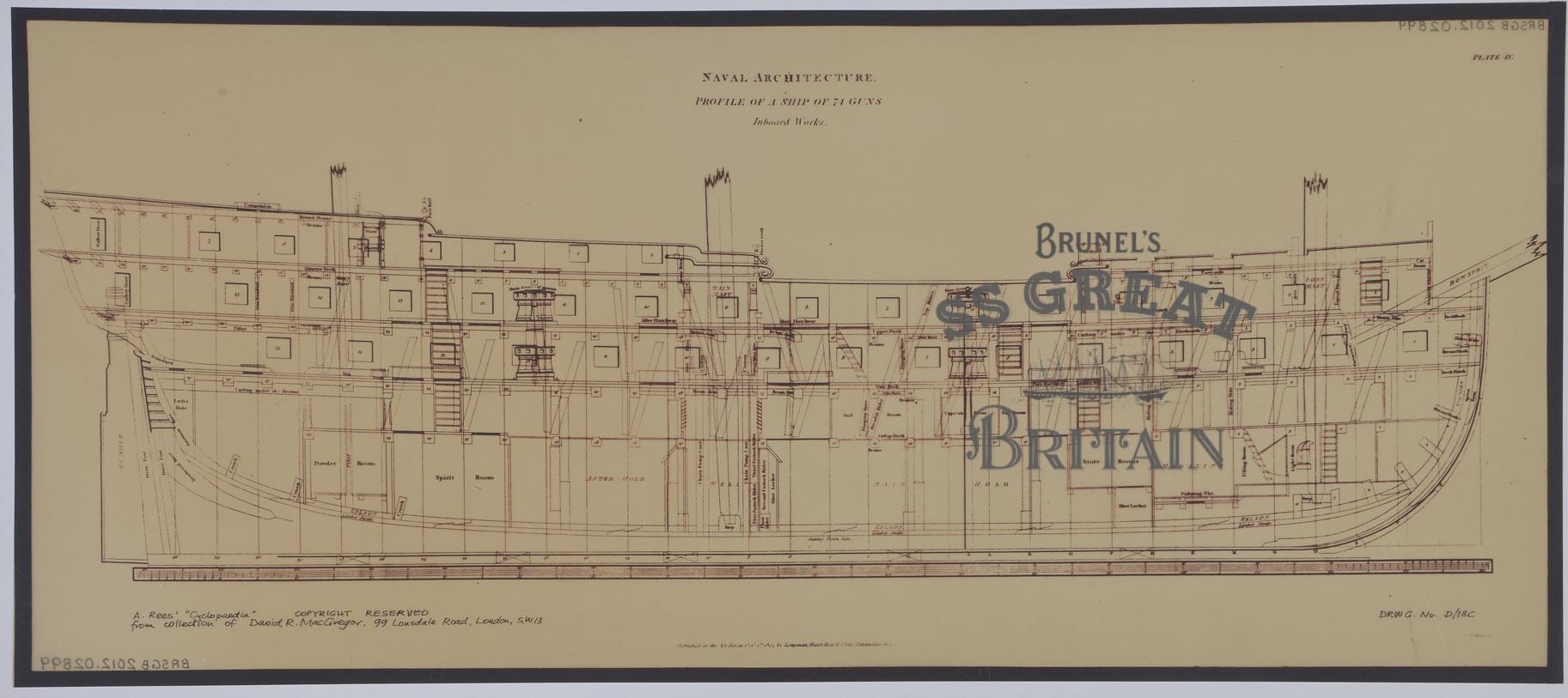 Description74 Gun Ship Ship of the Line. Profile (inboard) showing ship's internal layout. Scale 1/8 inch to 1 foot.