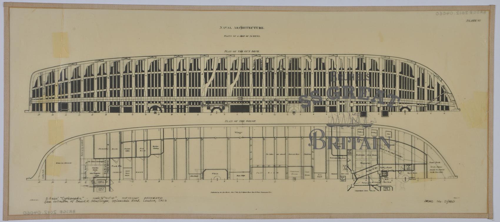 Description74 Gun Ship Ship of the Line. Half deck plans of the gun deck and the orlop. Scale 1/8 inch to 1 foot.