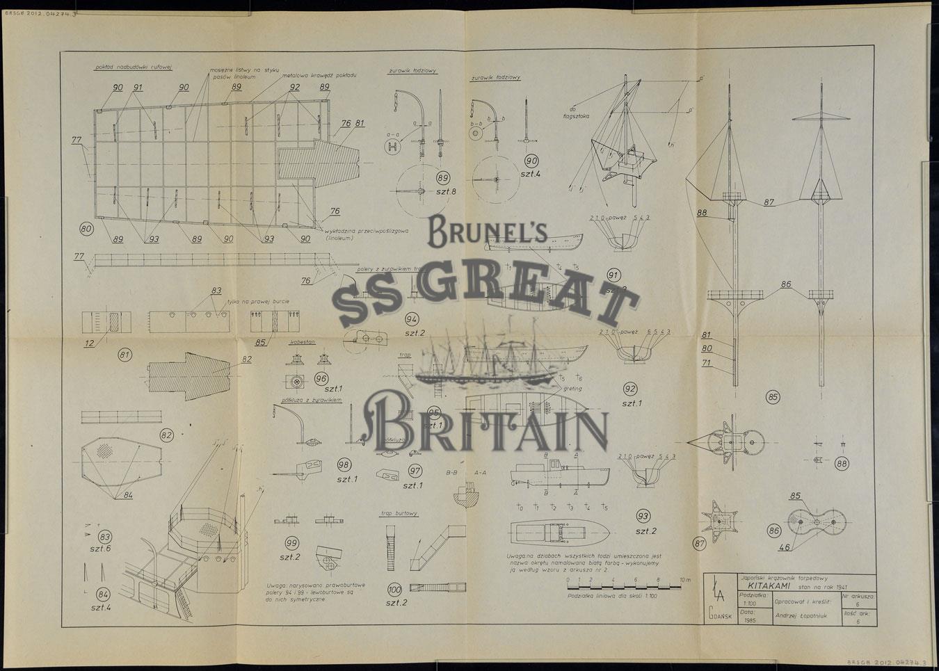 DescriptionShip modelling plan for the Imperial Japanese Navy Torpedo Cruiser Kitakami. Details of ship's fittings including armaments, onboard boats and masts. Scale 1:100. Text written in Polish. Plans printed on both sides of sheet.