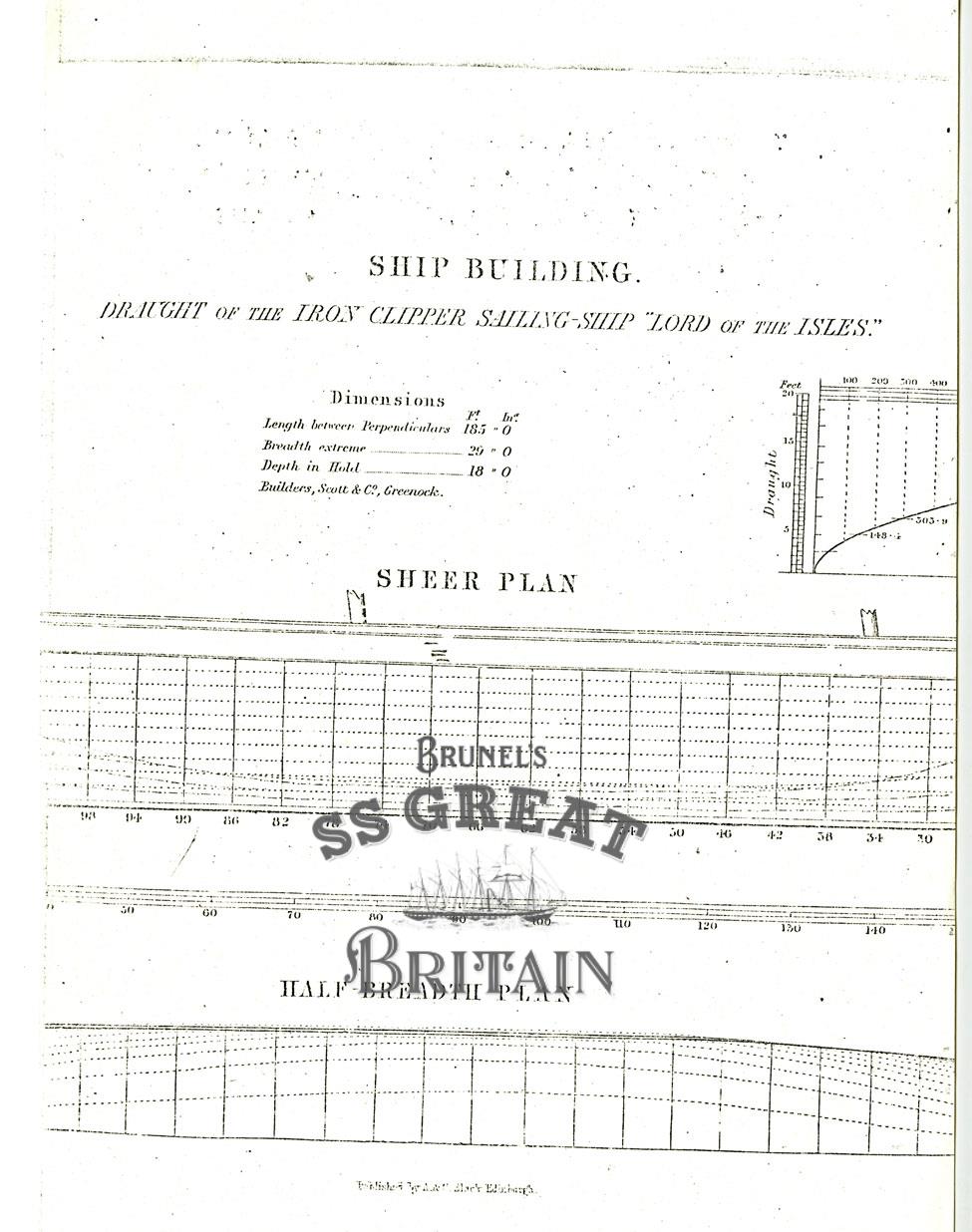DescriptionClipper Ship Lord of the Isles. Lines plan (partial sheer plan and half-breadth plan). Includes hull dimensions.