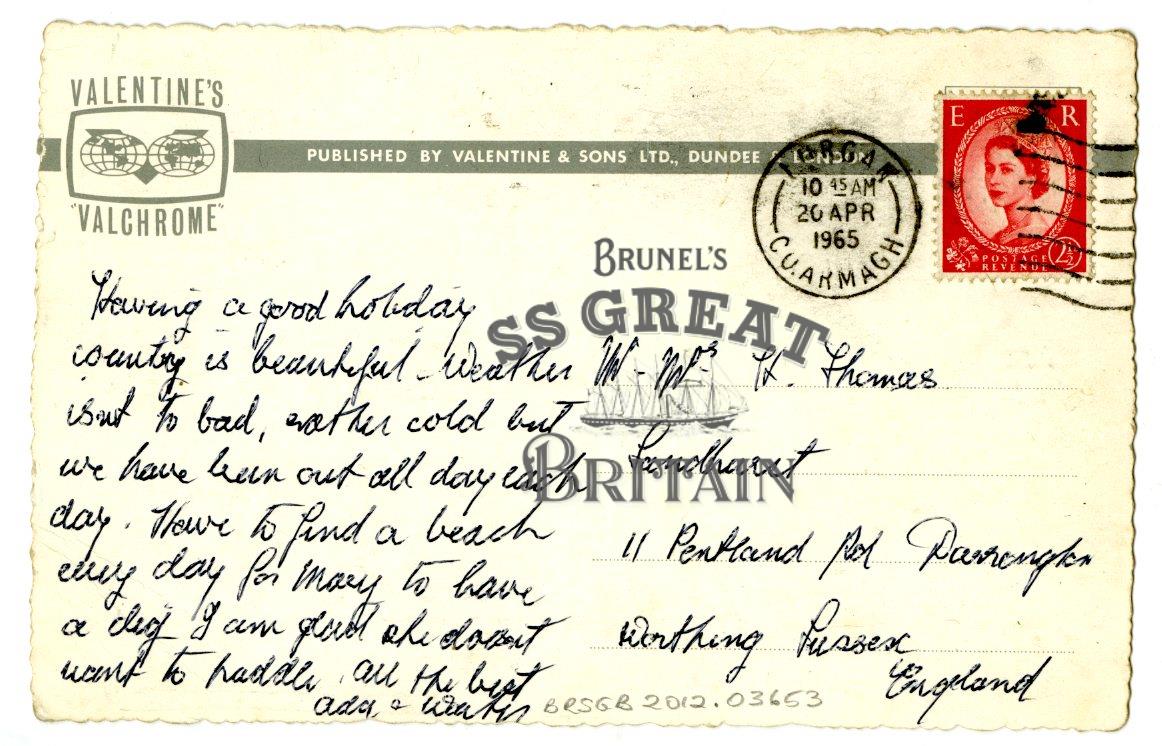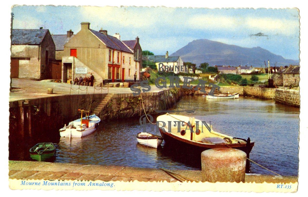 DescriptionLandscape orientation. Deckle edged. Recto: Annalong. Shows harbour with green rowboat bottom left, men outside building under 'Senior Service' sign, purple Mourne Mountains in background. Verso: message about Mary digging at beach. 1965. 2 1/2 d stamp.