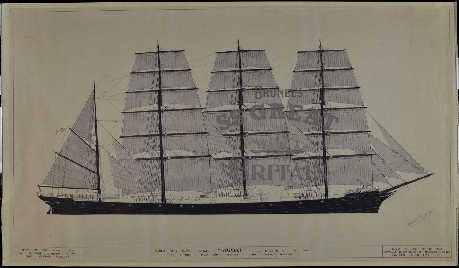 DescriptionFinnish Four Masted Barque Moshulu. Sail and rigging plan (profile), 1938-1939 under Erikson ownership. Scale 1/8 inch to 1 foot. Vessel formerly known as "Dreadnought" and "Kurt".