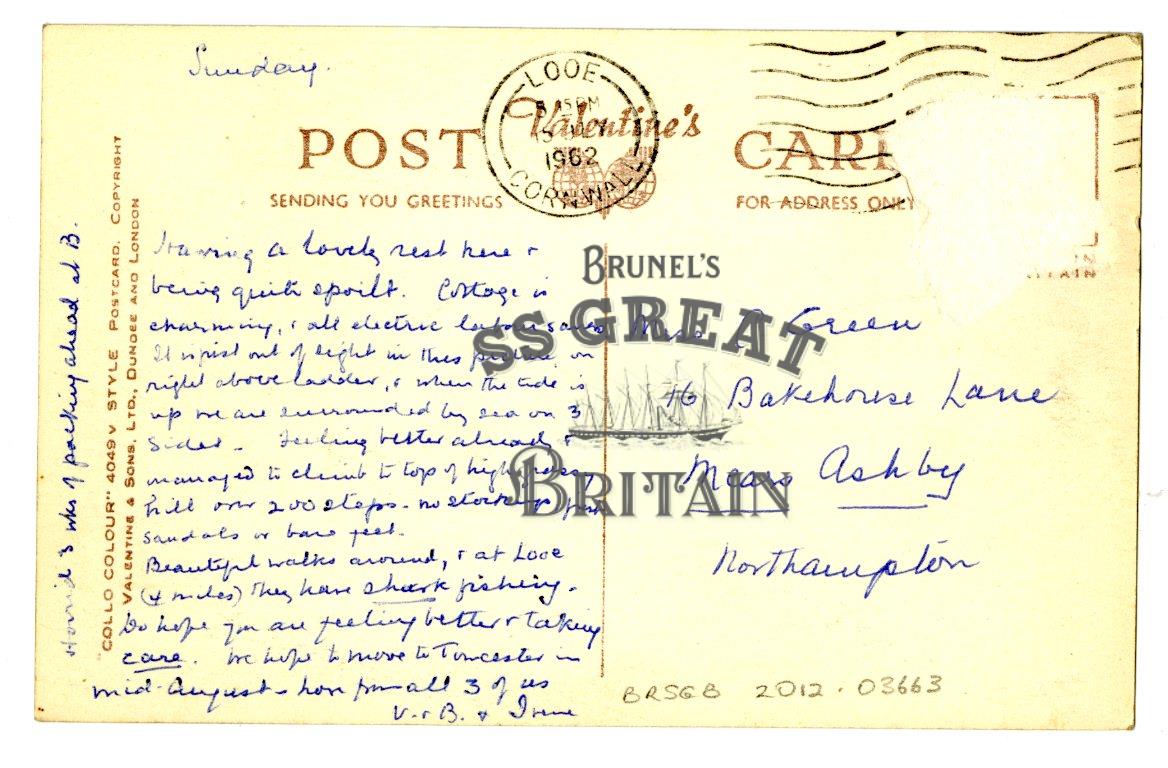 DescriptionLandscape orientation. Recto: Inner Harbour, Polperro. Shows moored yellow and orange boats in harbour, orange ladder in bottom right, yellow and white buildings up wooded hill in background. Verso: message about charming cottage. 1962. Stamp removed.