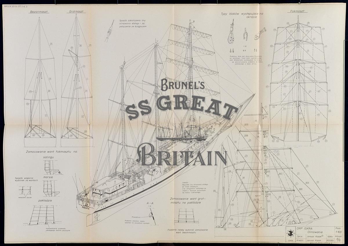 DescriptionShip modelling plan for the Polish Navy Training Ship ORP Iskra. Double-sided plan. Recto: Sail plans (profile) showing different sail arrangements and details of masts, boom and bowsprit. Scale 1:50 and Scale 1:250. Verso: Starboard side perspective view, looking from stern, of ship. Sail and rigging plans (profile, sections) of fore mast, main mast and mizzen mast. Details of rigging equipment. Scale 1:100.