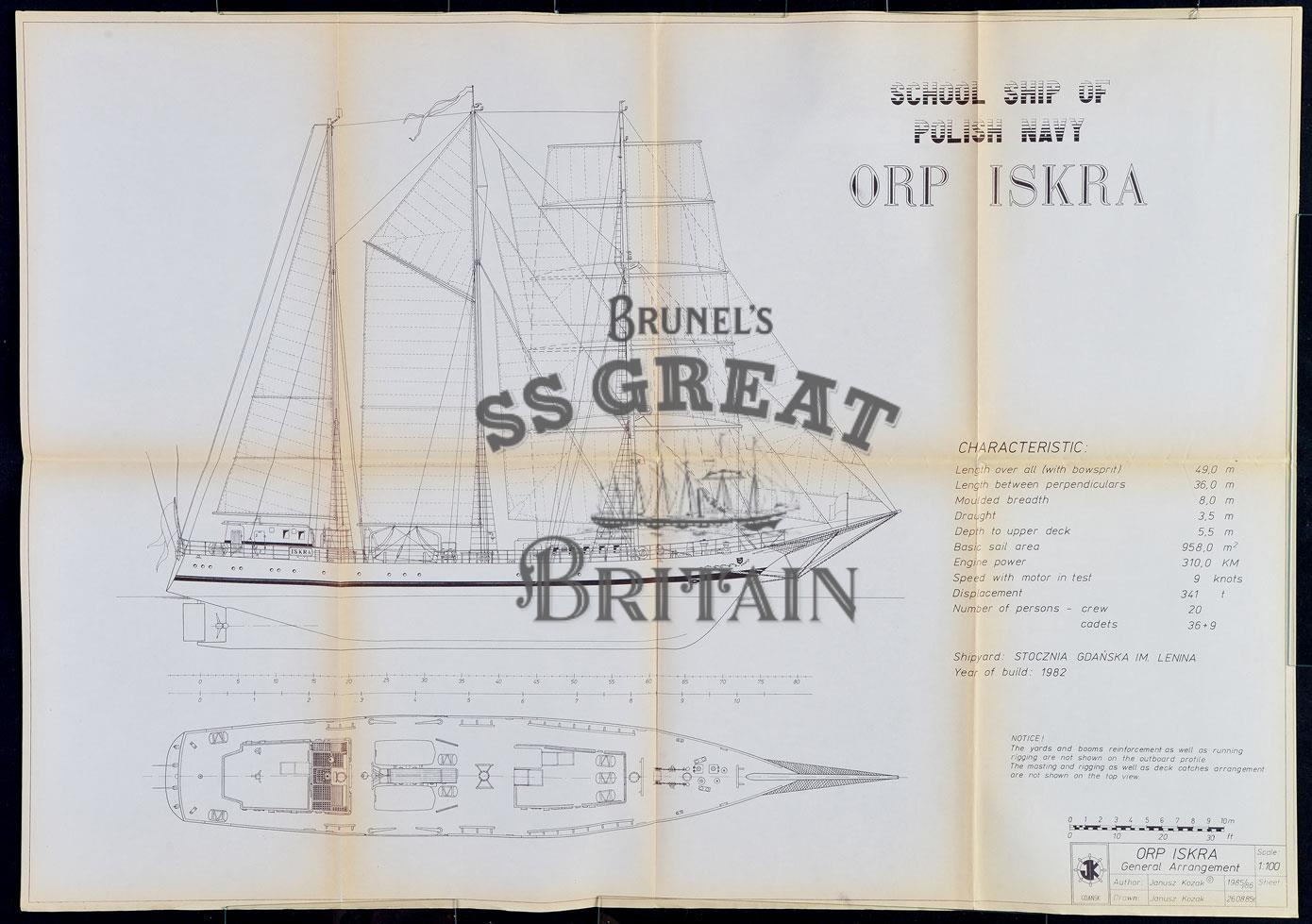 DescriptionShip modelling plan for the Polish Navy Training Ship ORP Iskra. General arrangement (profile, deck plan) and table of technical information. Written in English. Scale 1:100.