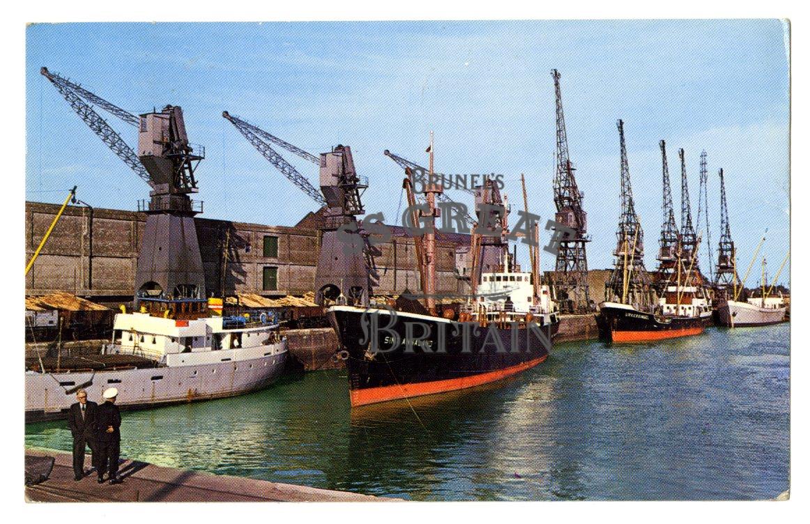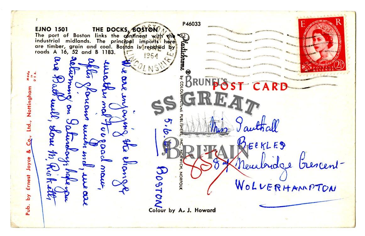 DescriptionLandscape orientation. Recto: view of the docks at Boston, Lincolnshire, showing 8 cranes and 4 boats and 2 men on quayside. Verso: message in blue ink at 90 degrees right about weather not too good. Sent to Miss Southall in Wolverhampton. Postmarked Boston Lincolnshire 4th June 1964 with a 2 1/2d stamp.