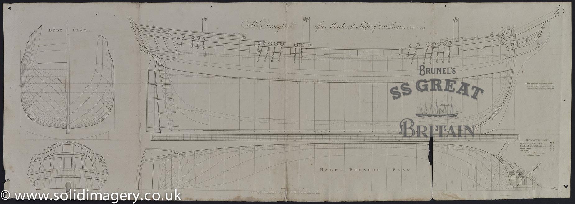 DescriptionMerchant Ship of 330 Tons. Profile, lines plan (sheer plan, half-breadth plan, body plan) and stern elevation. Includes dimensions.