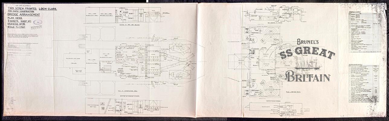 DescriptionLoch Class Frigates Nos.342 and 346-350. General arrangement (plans of superstructure and bridge decks, port side and starboard elevations of bulkhead and bulwark). Scale 1/2 inch to 1 foot. Includes tables of supply items. "Robb Caledon Shipbuilders Ltd" and David MacGregor Plans stamp marks in upper left section of plan.