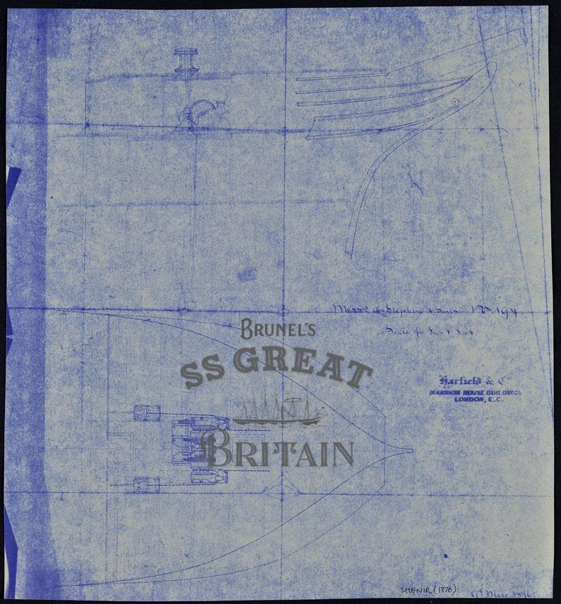 DescriptionIron Sailing Ship Shenir. Elevation and plan showing details and position of windlass. Scale 1/4 to 1 foot. "Harfield & Co." stamp mark in lower right of plan.