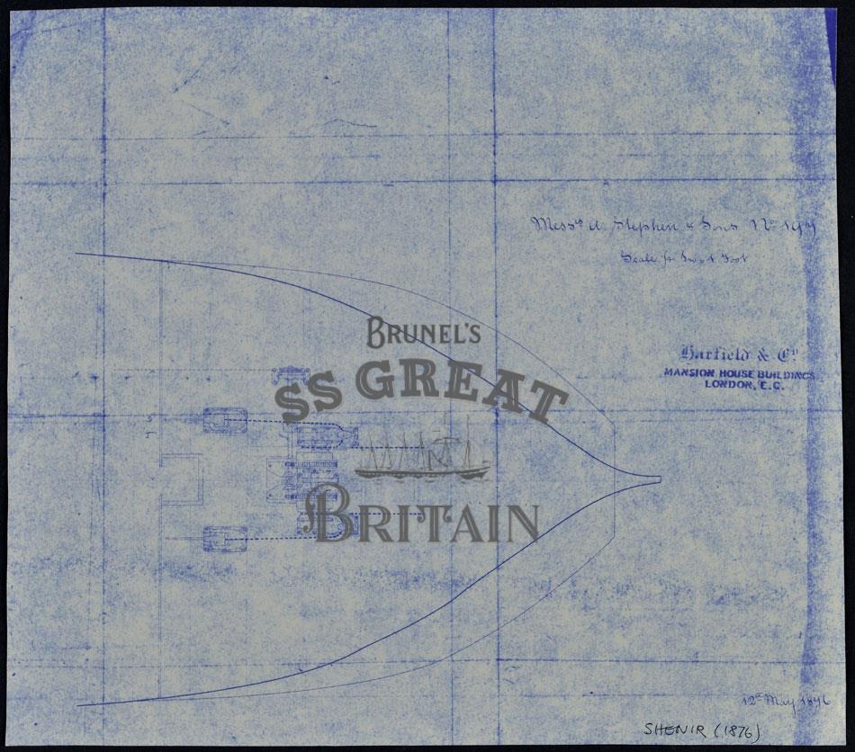 DescriptionIron Sailing Ship Shenir. Plan showing details and position of windlass. Scale 1/4 to 1 foot. "Harfield & Co." stamp mark in lower right of plan. Notes by David MacGregor regarding windlass design written on reverse side of plan.