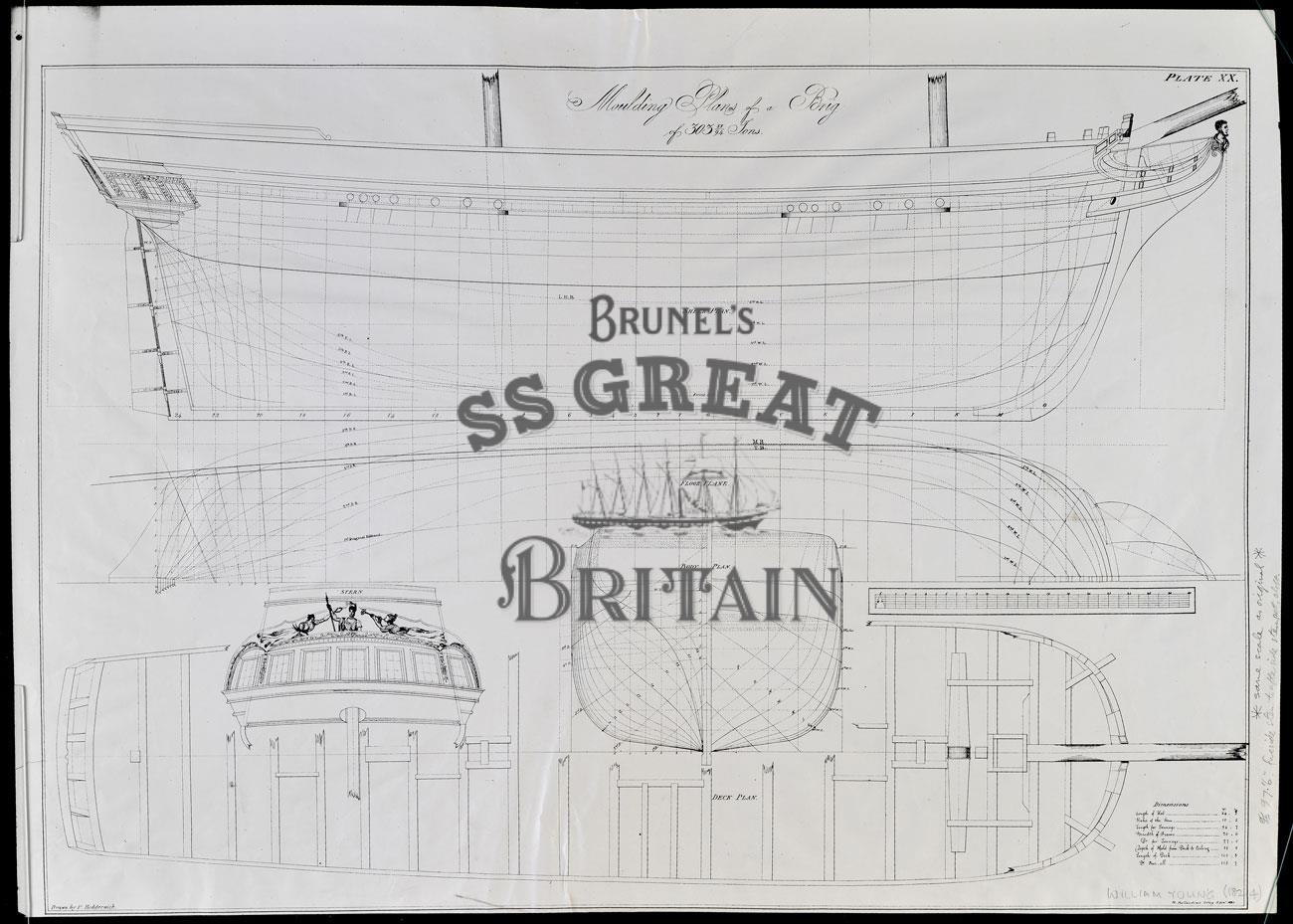 DescriptionWilliam Young. Lines plan (sheer plan, half-breadth plan, body plan), deck plan showing beams and stern elevation. Includes dimensions. Annotated.