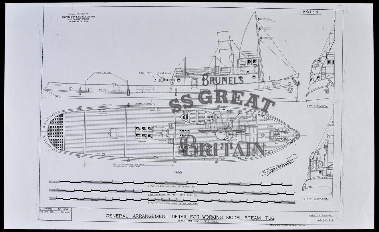 DescriptionWorking Model of Steam Tug. General arrangement (profile, deck plan), stern and bow elevations. Scale 1 inch to 5 feet.
