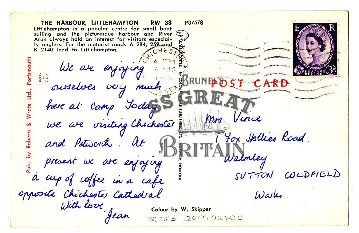 DescriptionLandscape orientation. Recto: Littlehampton. Shows boy fishing and man sitting on ramp with swans to left in foreground, boat with crane and funnel moored to wall in front of sheds in midground. Verso: message about enjoying a coffee in Chichester. Printed description of Littlehampton. 3d stamp