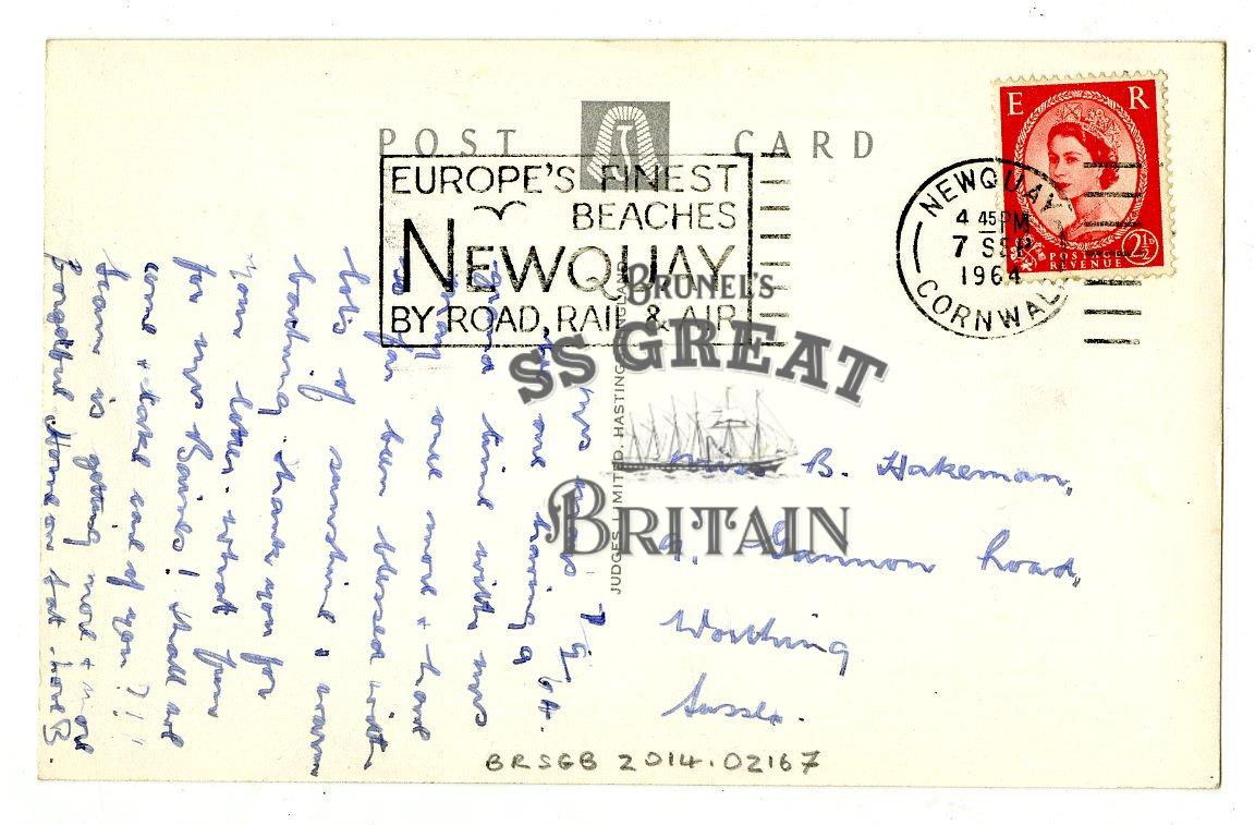DescriptionLandscape orientation. Recto: Shows jetty on left with gull on edge, boy standing by chain, man with stick behind, buildings inc. hotel round harbour wall. Verso: message about having grand time. 2 1/2d stamp.