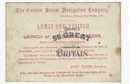 DescriptionA ticket issued by 'The Eastern Steam Navigation Company', Millwall, Poplar, to 'Admit One Visitor to the Launch of the Great Eastern', dated 31 October 1857. Printed in red on card. The ticket states 'It is expected that the Launch will commence on Tuesday, the 3rd of November, about 11 o'Clock am., and will probably last Two days.' The ticket is signed John Yates.