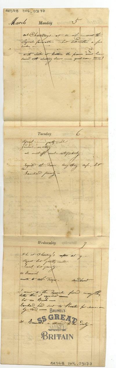 DescriptionPart of a diary page by Sir Marc Brunel. Covers Thursday 1st to Wednesday 7th March, no entry for the Sunday, and no year given.