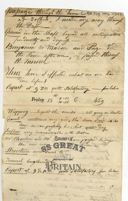 He discusses the work on the Thames Tunnel, including the state of the ground in the shaft, inspecting the works at Wapping, and the influx of water in the shaft. He talks about the first occasion he passed through the whole tunnel - 'Thus have I effected what no one has done before!' He mentions the other people who were first to go through the tunnel - 'Benjamin Mr Mason and Page', 'Mr [Chartier?] and Mr Curtis', and later 'Sophia (viz Mrs Hawes) her daughter and children.- Miss Henrietta Wollaston - Mr Brown one of our directors - many ladies and all the men went through and returned.'