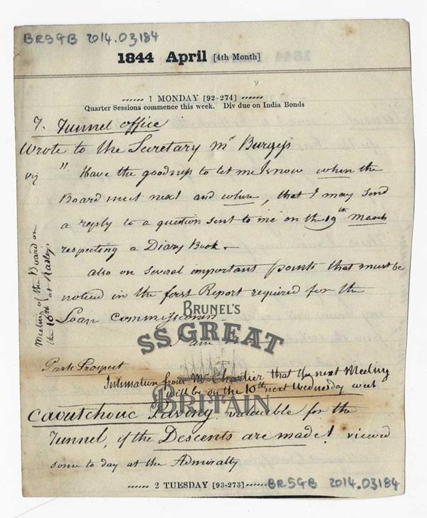 DescriptionCutting from a diary page, dated 28 March and 1 April 1844. Not clear if I. K. Brunel or Sir Marc Brunel, but the handwriting looks more like Marc Brunel's.