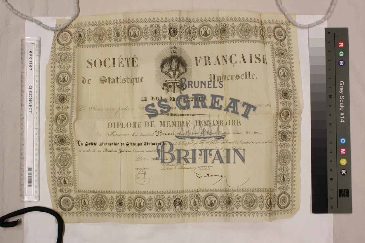 DescriptionDiplome de Membre Honoraire for Sir Marc Brunel, Vice President of the Royal Society of London, from the Societe Francaise de Statistique Universelle. Dated 31 July 1833.