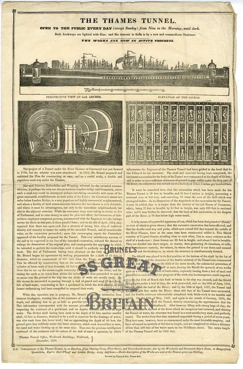 DescriptionAdvertisement for the opening of Marc Isambard Brunel's Thames Tunnel to the public, with three sections of the tunnel, including a longitudinal section of the tunnel beneath the Thames, the two arched entrances from the shaft, and a representation of the iron shield, plus a description of the project.