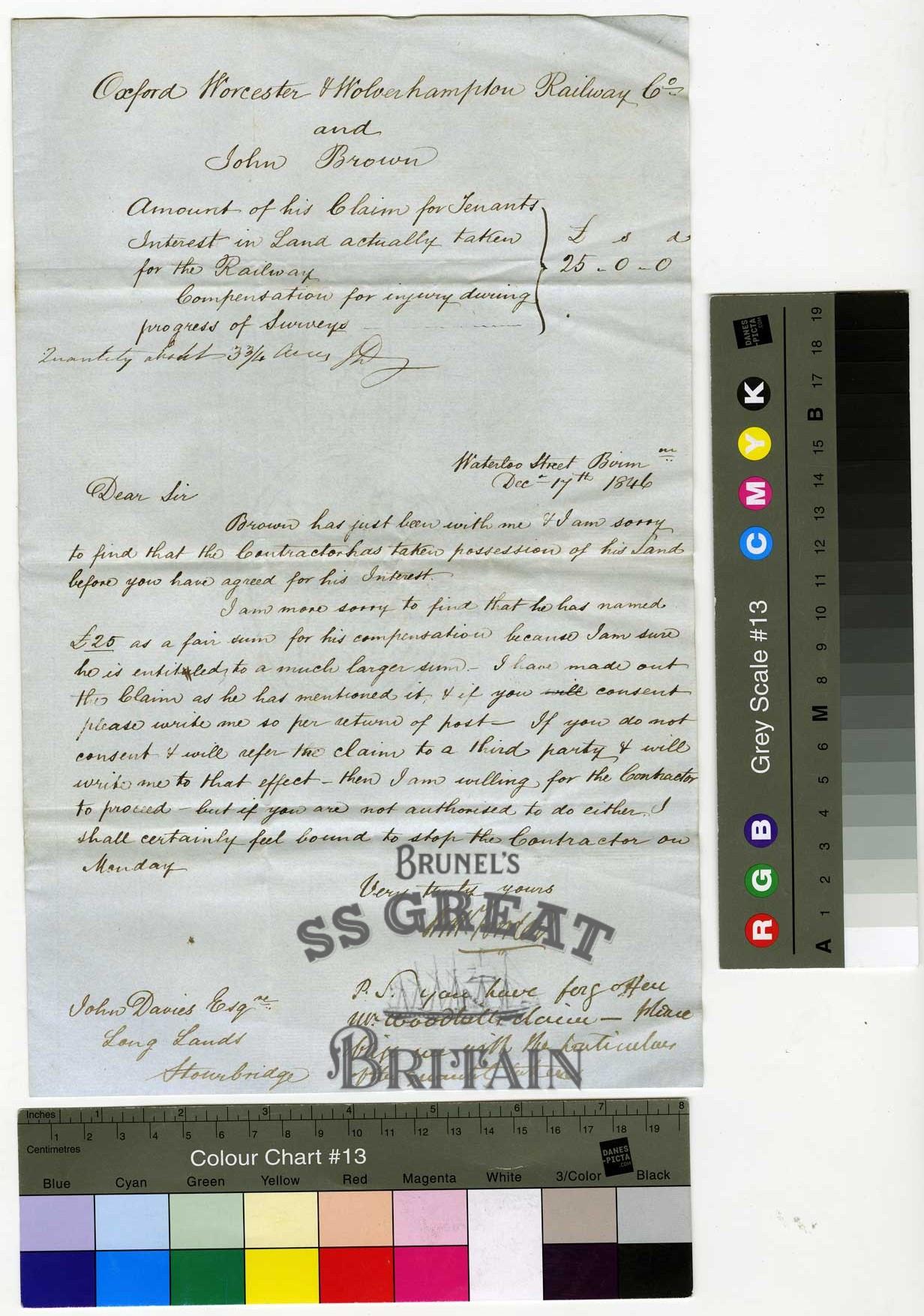 TitleLetter from Mr Fowler to J. Davies, Stourbridge of the Oxford, Worcester and Wolverhampton Railway regarding John Brown's claim for compensation, 17 December 1846