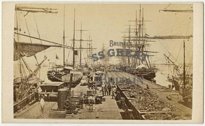DescriptionLandscape orientation. Sail ships at Sandridge Railway Pier, Melbourne, Australia. Sail ships are lined along either side of pier. Carts carrying either rubble or coal are seen in foreground of image. Other machinery is to left of carts with people standing by, most are addressing the camera. Several rail lines run up and down pier most with carts on at differing distances from photographer.