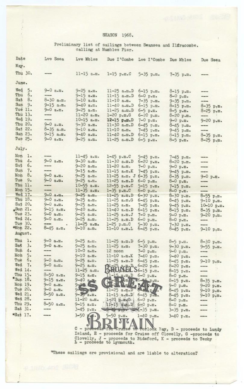 TitleList of sailings between Swansea and Ilfracombe for the season June-August 1968