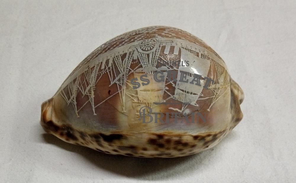 The shell was carved by Charles H. Wood - 'Wood Sc[ulpsit]' is engraved on the bottom right edge of the shell. He was known for producing carved nautilus and cowrie shells, including others of all three of Brunel's ships. Some of his shells were presented to Queen Victoria or exhibited in the Great Exhibition.