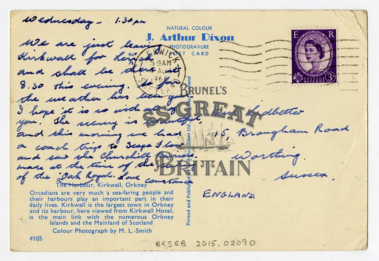 DescriptionLandscape orientation. Recto: Shows sheds on jetty in foreground, ship moored on right and boat moored on left of building in midground, moorland in background. Verso: message about a coach trip to Scapa Flow. 3d stamp.