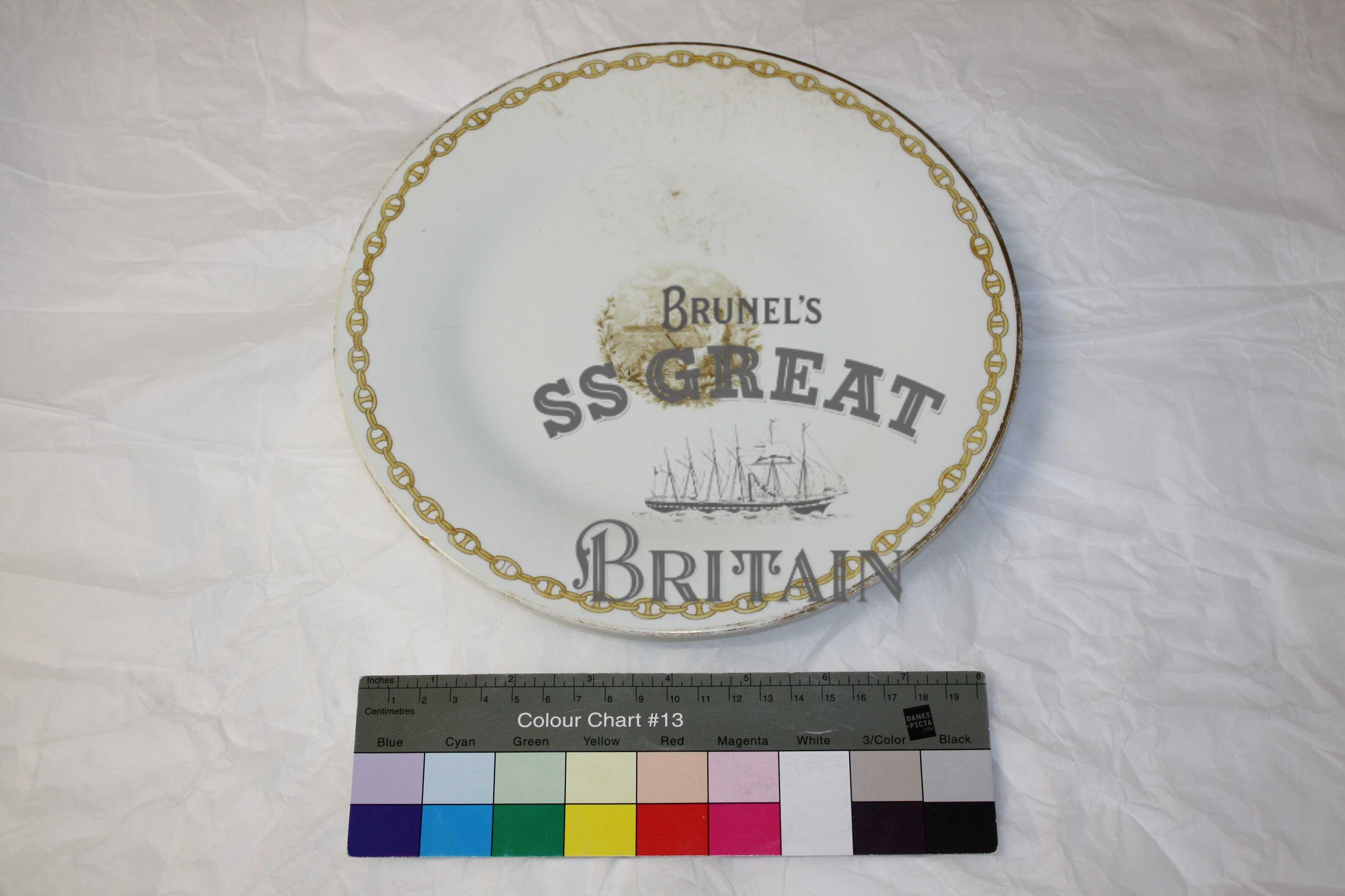 DescriptionPlate from the ss Great Eastern in white with gold detailing. Plate is docorated with gold paint around the rim, a gold chain link design around the edge, and a image of Britannia and a ship in the centre of the plate. Britannia is sat facing left with an anchor at her feet while the ship is under sail in the background. The image in the centre of the plate is slightly worn and faded. On the back of the plate is a W. H. Kerr Binns & Co. manufacturers stamp. Plate measure 236mm in diamenter. Hairline cracks and some discolouration across the top half of the plate and a small chip mark near the the right of the plate edge. Some loss of the paint around the rim. Part of the chain link design around the edge at the bottom had not been painted. Great Ship Company Limited stamp on bottom of plate and hairline cracks near top edge.