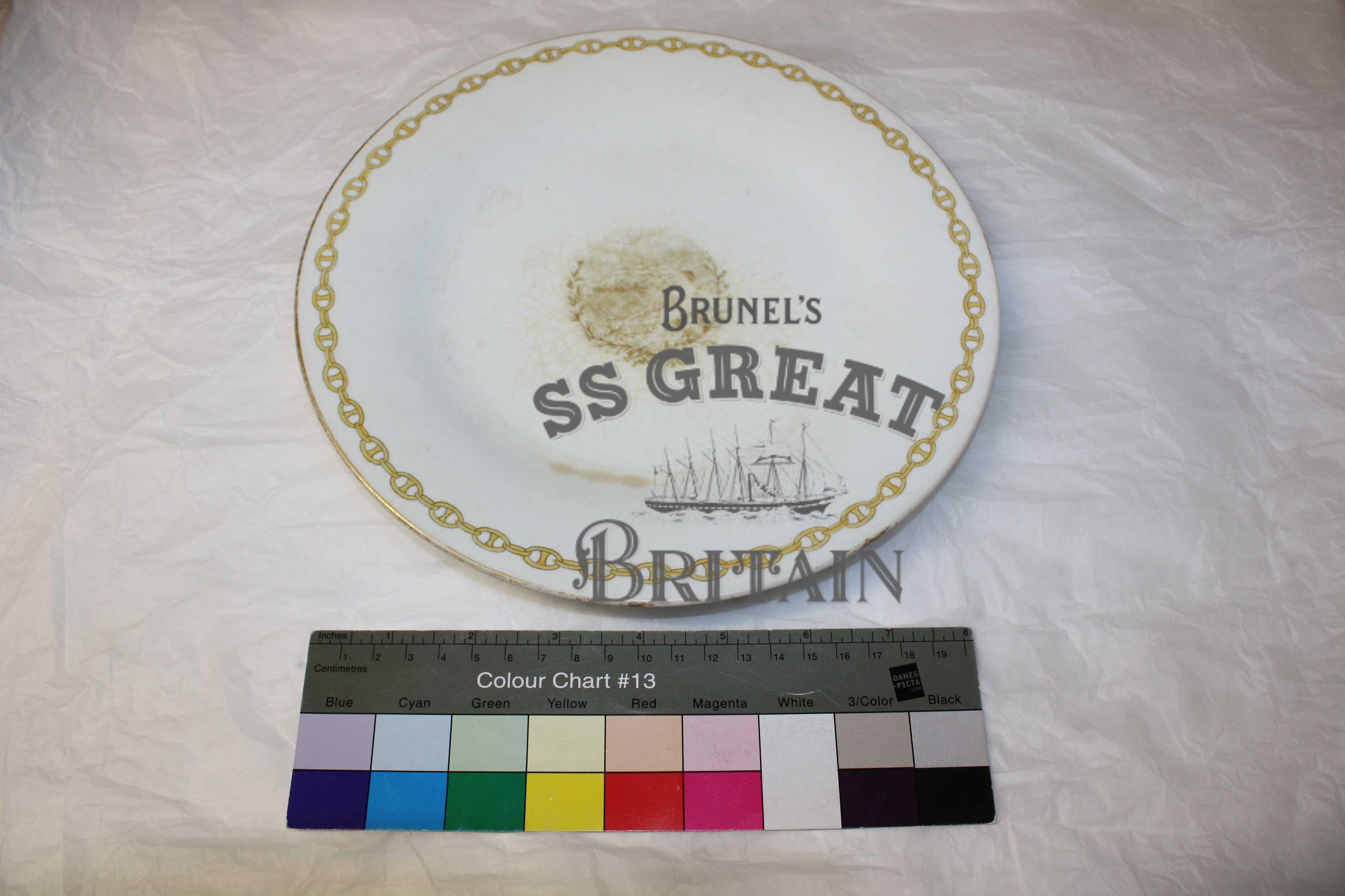 DescriptionPlate from the ss Great Eastern in white with gold detailing. Plate is decorated with gilding around the rim and a gold chain link motif around the edge. In the centre is a circular design: Britannia is sat facing left with an anchor at her feet, a ship is under sail in the background. The image is worn, smudged and hard to discern. On the back of the plate is a W. H. Kerr Binns & Co. manufacturers stamp. Plate measures 238mm in diameter. Great Ship Company Limited stamp on bottom.