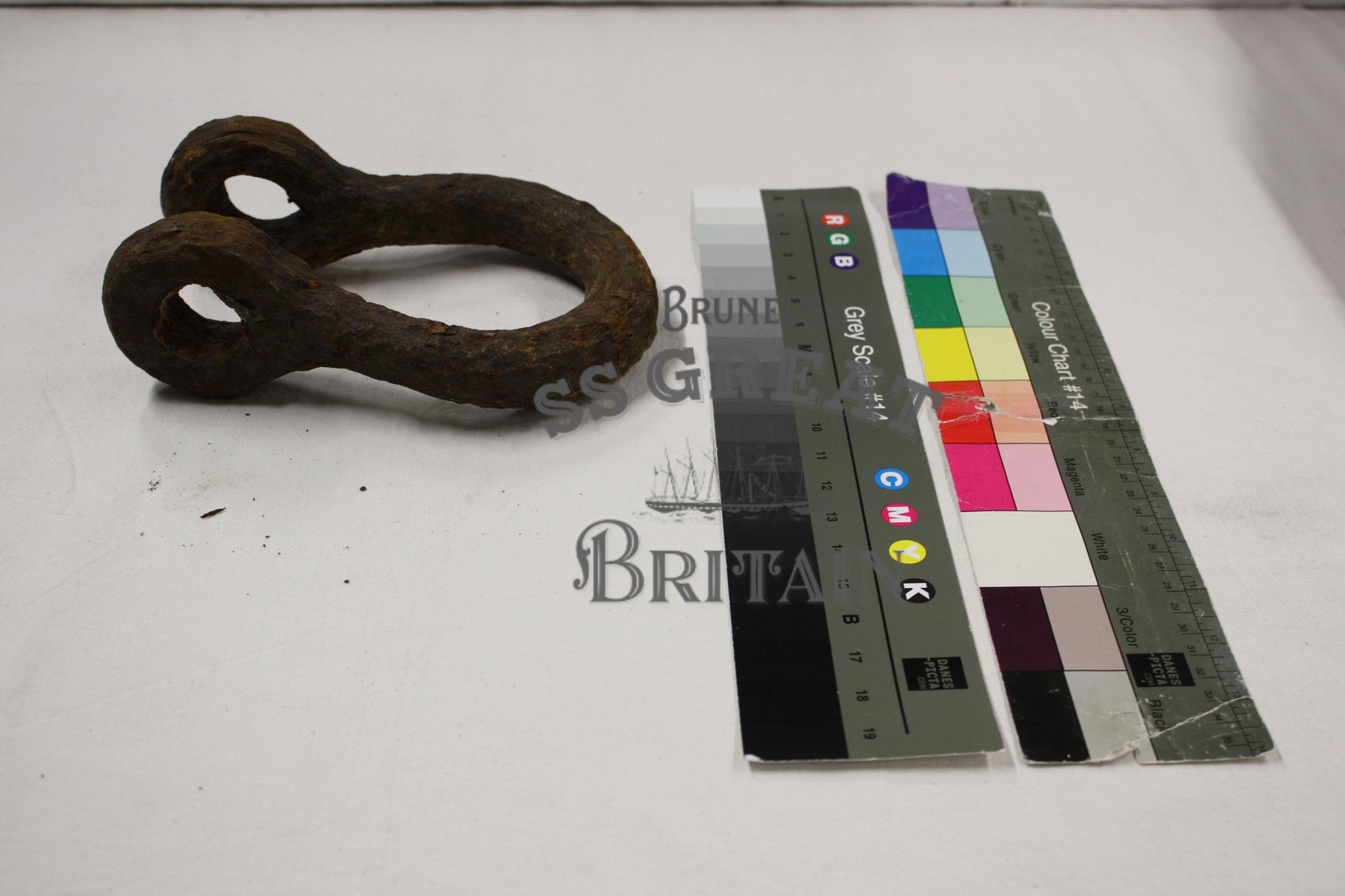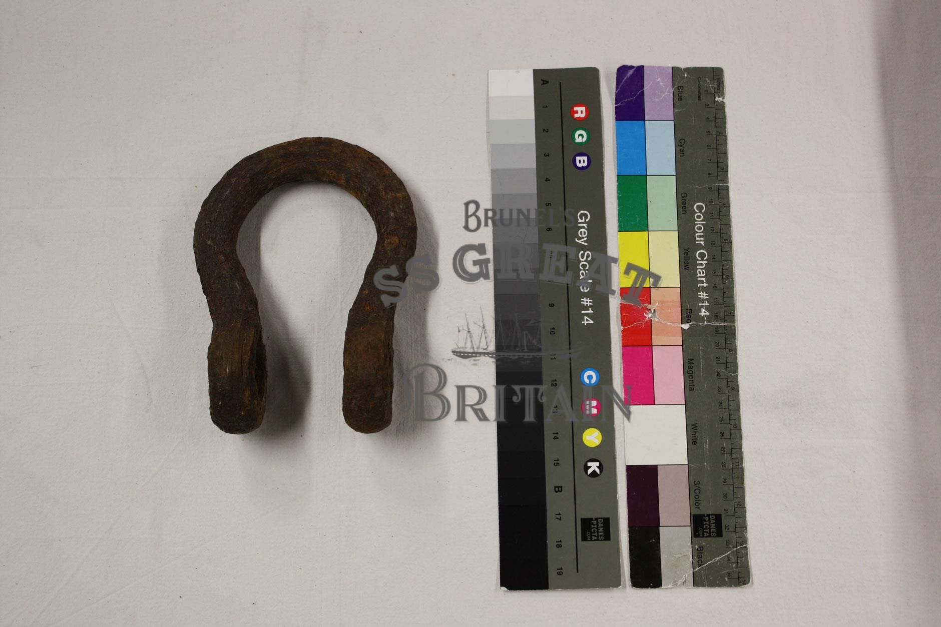 DescriptionHorse shoe shaped iron shackle. Bolt missing.