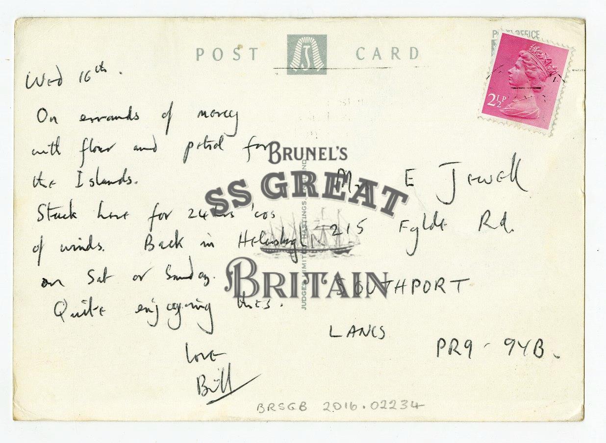 DescriptionLandscape orientation. Recto: High view over greenery to town; large white ship moored to jetty on right; harbour buildings from right to left in midground; open sea in background. Verso: message about errands of mercy. 2 1/2p stamp.