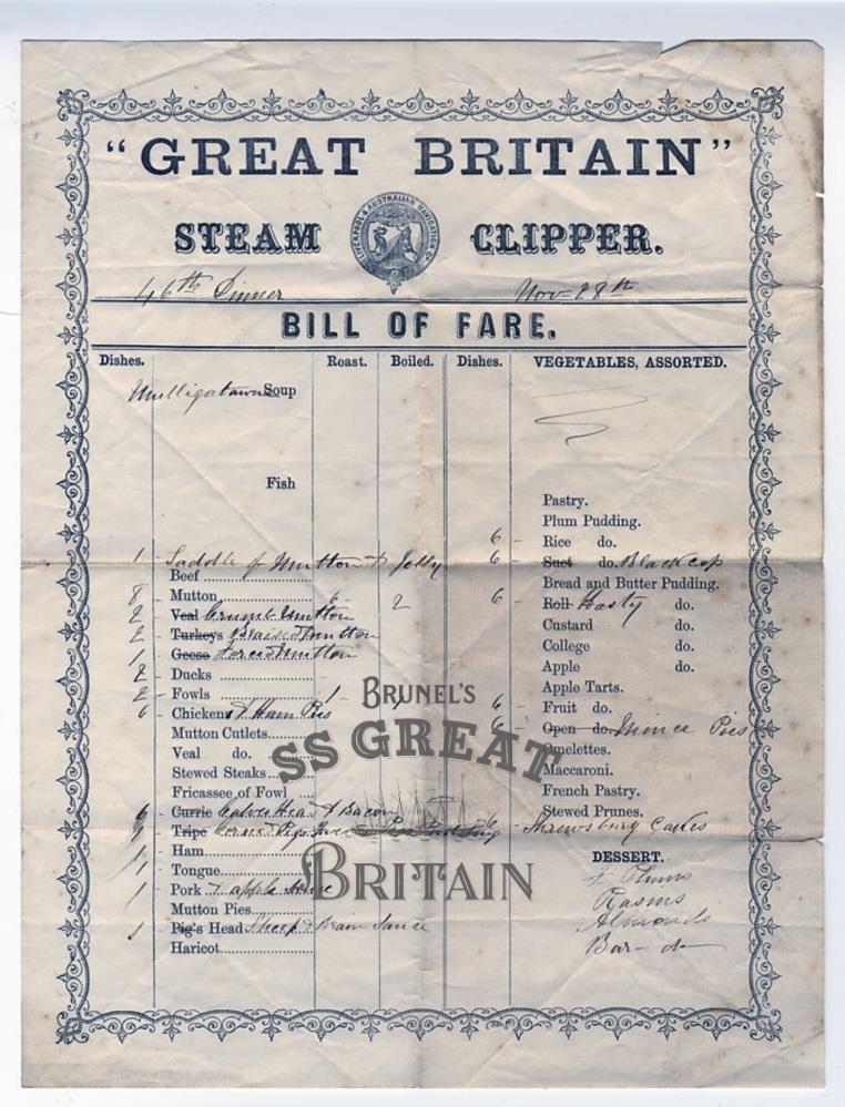 Title"Great Britain" Steam Clipper Bill of Fare 28 November 1863