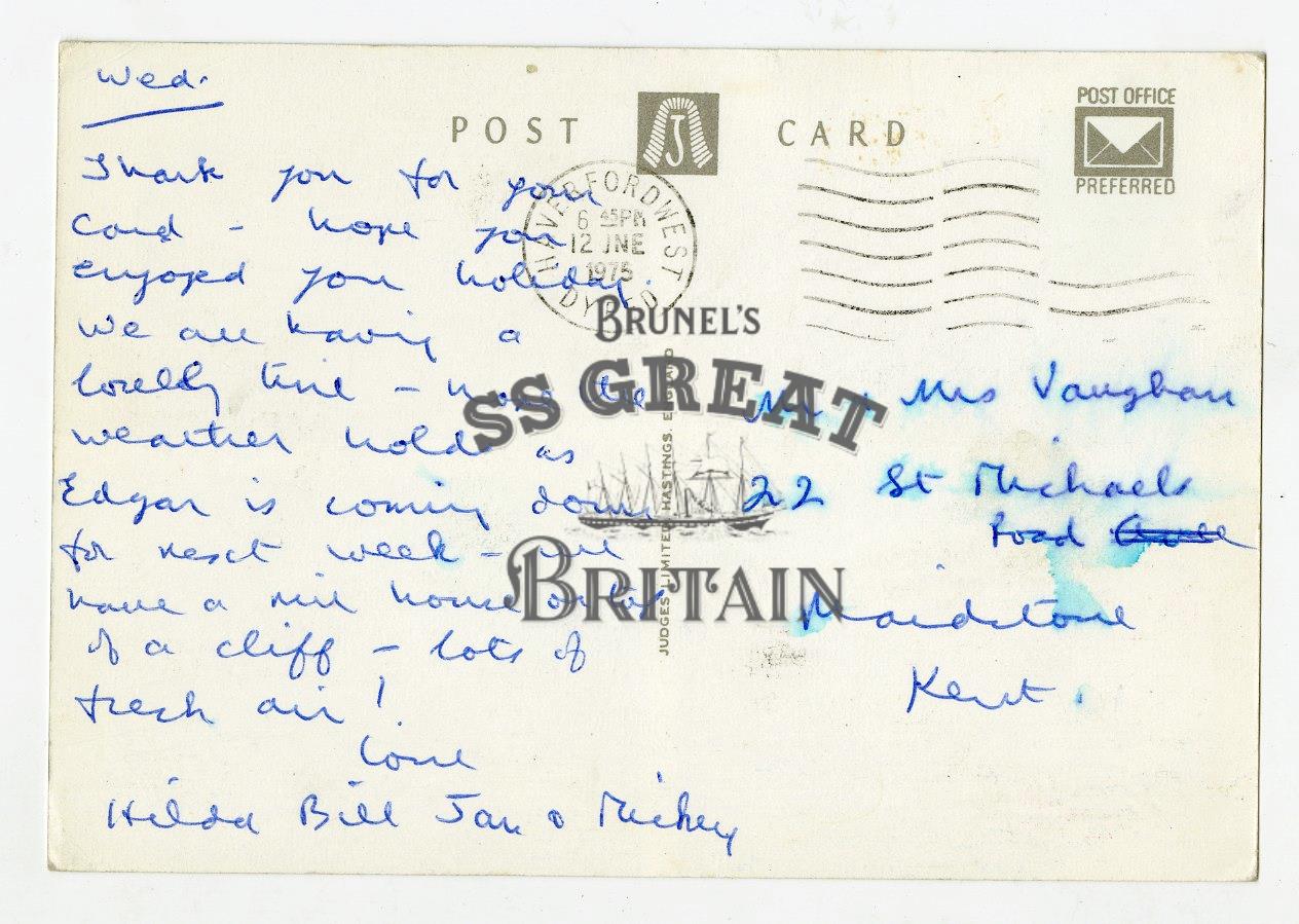 DescriptionLandscape orientation. Recto: 4 views surrounding central panel reading 'Fishguard'; top ones are high views of harbour; bottom left - boats moored in harbour; bottom right - red-funnelled ship. Verso: message about nice house on cliff. No stamp.