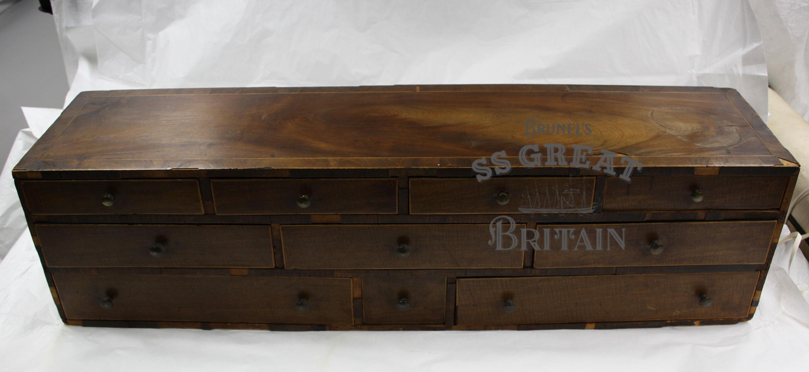 DescriptionChest of 10 wooden drawers donated by or belonged to Christopher Gibson from Atlantic Cable, ss Great Eastern. A mixeture of hardwood and softwood. Hardwood panel detail on top of chest. Dameage and small losses on the front of drawers and on corners.