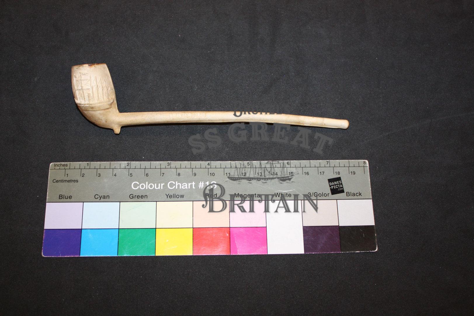 DescriptionClay pipe with a bust of Isambard Kingdom Brunel and an image of the SS Great Britain molded on either side of the bowl. The tip of the stem is glazed and along the stem is lettered 'Bristol 1848'.