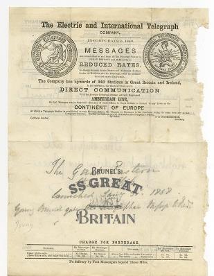 Sent on the 31st January 1858. the telegram informs Isambard of the launch of the SS Great Eastern in Millwall, London. 'The ship is all right afloat and in her place'.